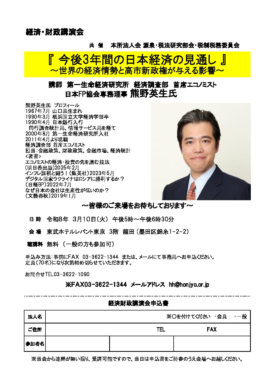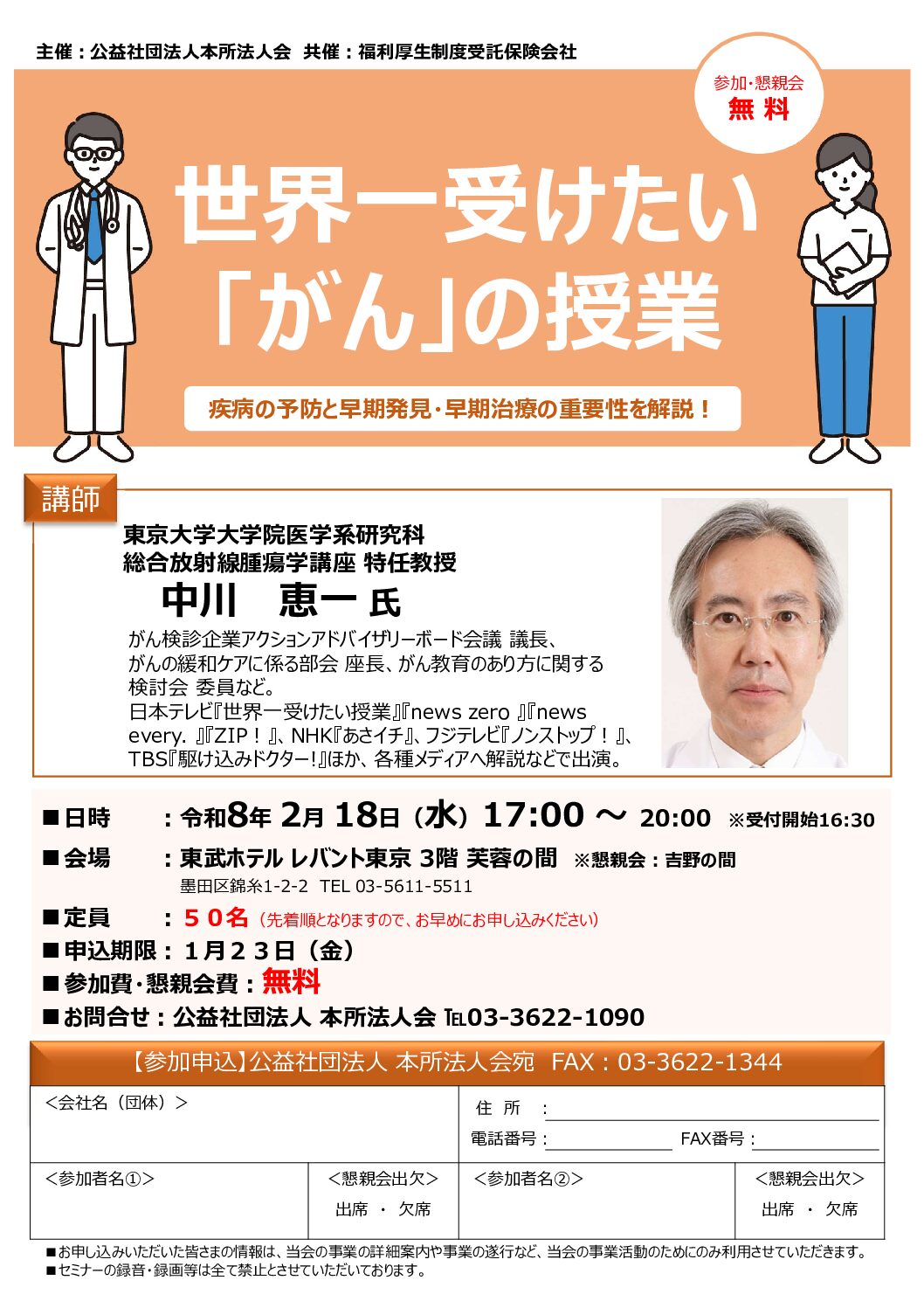 2月18日(水)福利厚生制度受託保険会社と本所法人会公益事業委員会共催で『世界一受けたい「がん」の授業』及び懇親会が開催されます! 申込おまちしております。20260218_【案内チラシ】世界一受けたい「がん」の授業