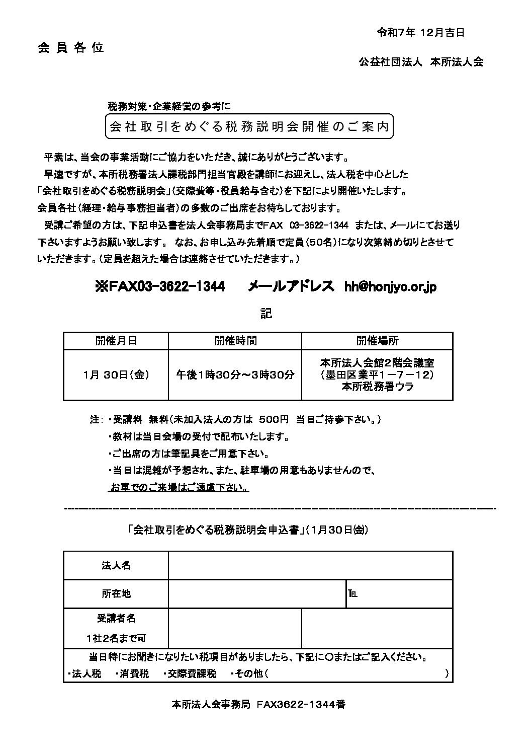 1月 30日(金)午後1時30分~本所法人会館2階会議室にて会社取引をめぐる税務説明会を開催致します。 毎年人気の説明会となっております。お申込お待ちしております。会社取引をめぐる税務説明会案内R7